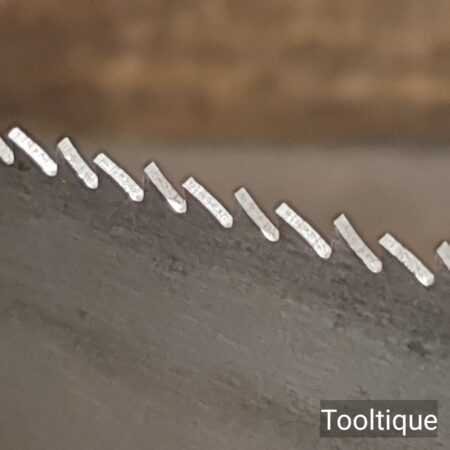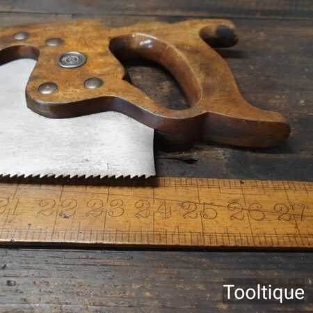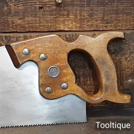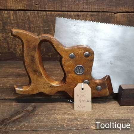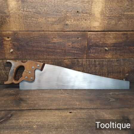 Vintage Henry Disston Canada 24” Rip Saw with 6 Tpi, fully refurbished ready for use and in good used condition. The saw has been sharpened Rip with a relaxed rake at the toe for easy start progressively increasing in aggressiveness towards the handle. Note: Canadian Disston’s didn’t have the same reputation as the earlier Philadelphian models but this wasn’t to do with the steel, it was more to do with the wooden handle. The saw has been thoroughly cleaned, jointed, resharpened and set by hand so that all the hard work of getting an old vintage saw right has been undertaken. We do this so that the next sharpening is easier and no more than a quick freshen up would be required. Those who are familiar with sharpening will know this is no small job and requires skill, effort and time to achieve good results.
