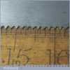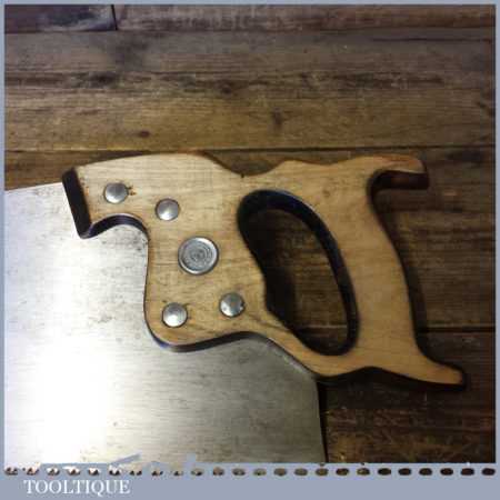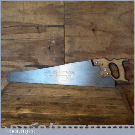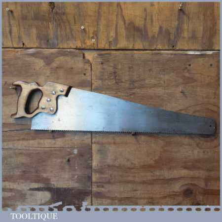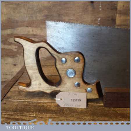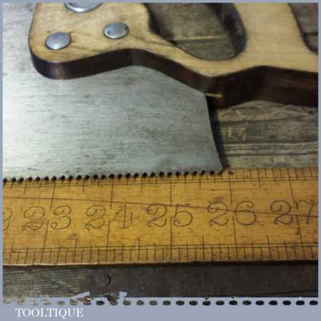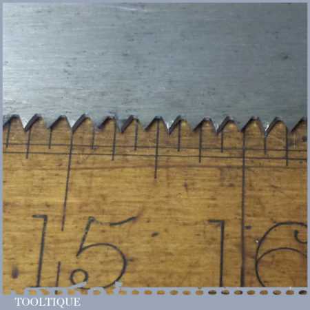 The saw has been thoroughly cleaned, jointed, resharpened and set by hand so that all the hard work of getting an old vintage saw right has been undertaken. We do this so that the next sharpening is easier and no more than a quick freshen up would be required. Those who are familiar with sharpening will know this is no small job and requires skill, effort and time to achieve good results.
