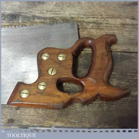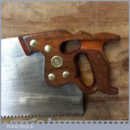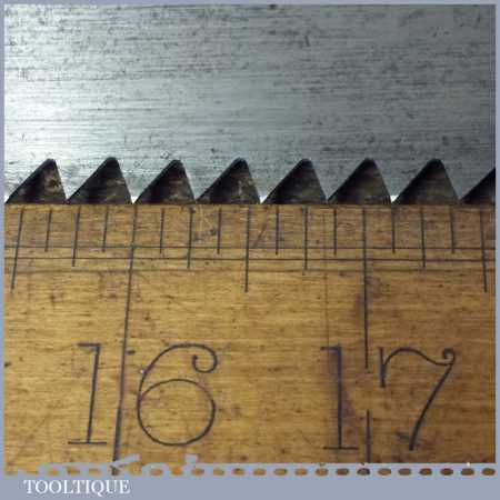 The saw has been thoroughly cleaned, jointed, resharpened and set by hand so that all the hard work of getting an old vintage saw right has been undertaken. We do this so that the next sharpening is easier and no more than a quick freshen up would be required. Those who are familiar with sharpening will know this is no small job and requires skill, effort and time to achieve good results.