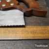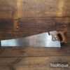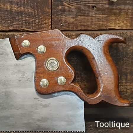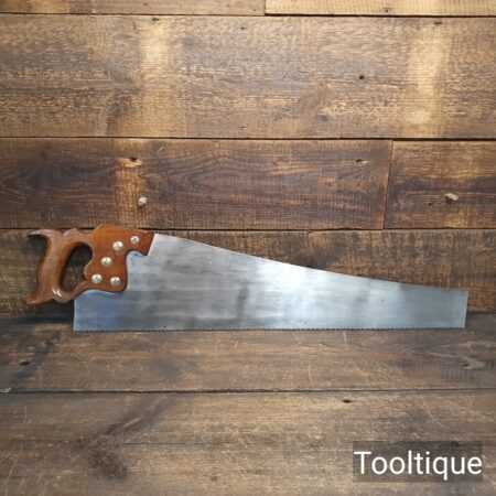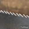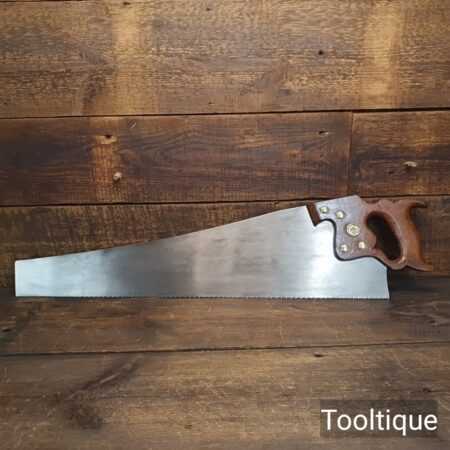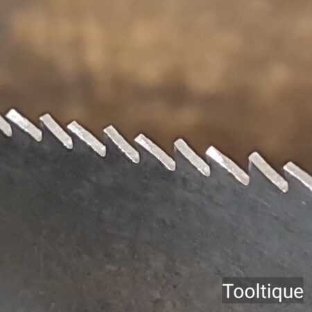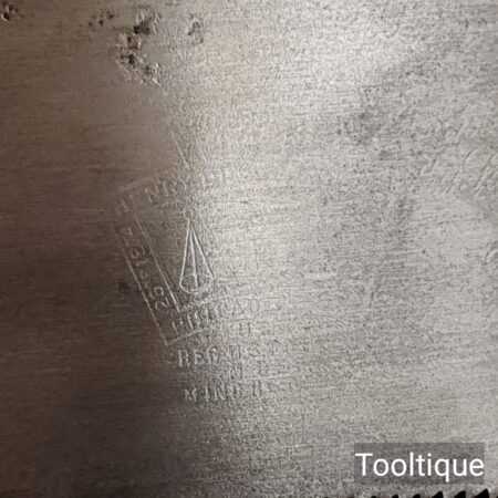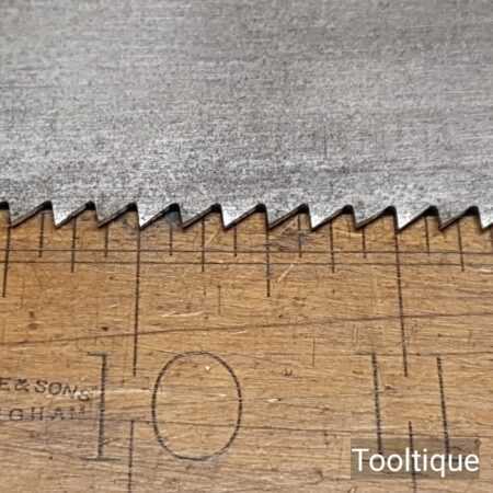 The saw has been thoroughly cleaned, jointed, resharpened and set by hand so that all the hard work of getting an old vintage saw right has been undertaken. We do this so that the next sharpening is easier and no more than a quick freshen up would be required. Those who are familiar with sharpening will know this is no small job and requires skill, effort and time to achieve good results.