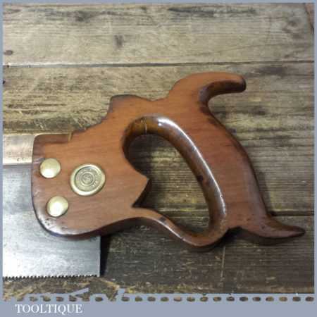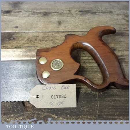 The saw has been thoroughly cleaned including under the handle, jointed, resharpened and set by hand so that all the hard work of getting an old vintage saw right has been undertaken. We do this so that the next sharpening is easier and no more than a quick freshen up would be required. Those who are familiar with sharpening will know this is no small job and requires skill, effort and time to achieve good results.