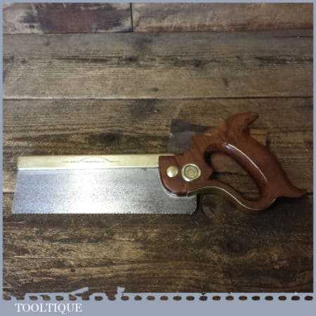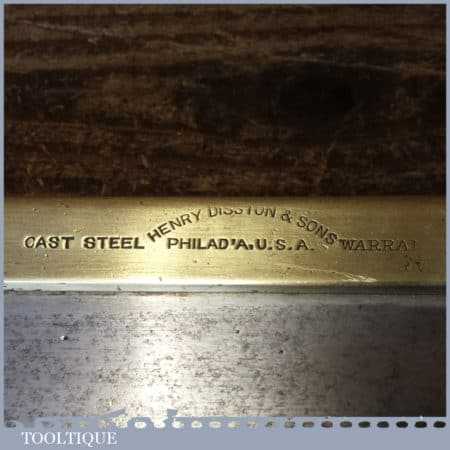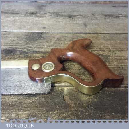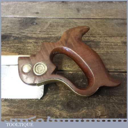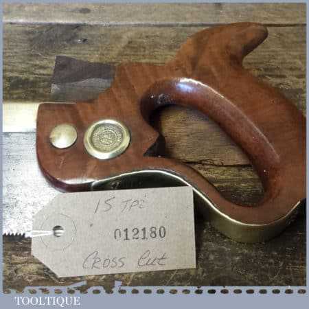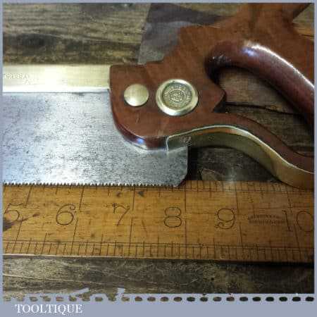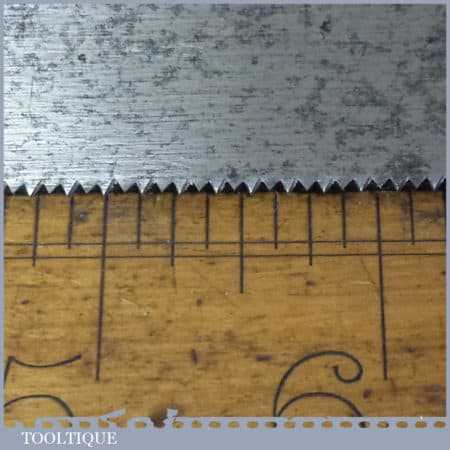 The saw has been thoroughly cleaned including under the handle, jointed, resharpened and set by hand so that all the hard work of getting an old vintage saw right has been undertaken. We do this so that the next sharpening is easier and no more than a quick freshen up would be required. Those who are familiar with sharpening will know this is no small job and requires skill, effort and time to achieve good results.