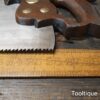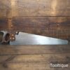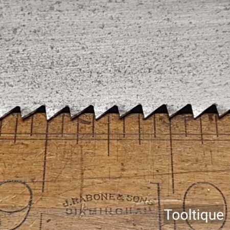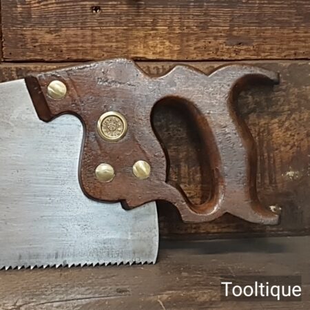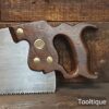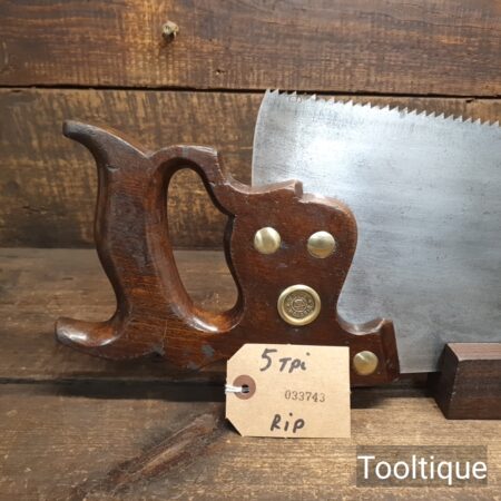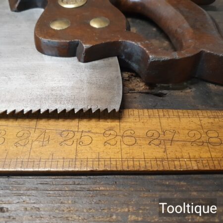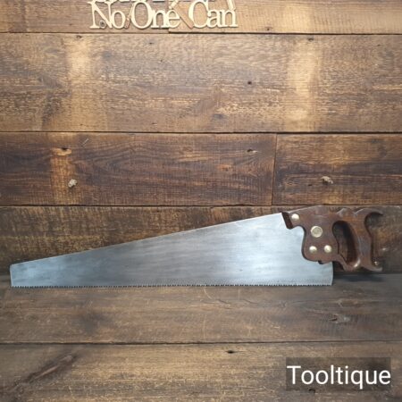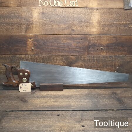 Vintage Henry Disston Philadelphian 26” Rip Saw with 5 Tpi and Applewood Handle, refurbished ready for use and in good used condition. These are the undoubtably the best period of productions and in my experienced opinion the quality has never been surpassed by any maker, before or since because these are hard on the file but supple enough to set. Note: Sharpened a graduated aggression Rip where the toe has a relaxed rake for an easier start and less prone to snatching becoming more aggressive towards the handle. It has had the full treatment that involves lots of time and effort. The saw has been thoroughly cleaned, jointed, resharpened and set by hand so that all the hard work of getting an old vintage saw right has been undertaken. We do this so that the next sharpening is easier and no more than a quick freshen up would be required. Those who are familiar with sharpening will know this is no small job and requires skill, effort and time to achieve good results.