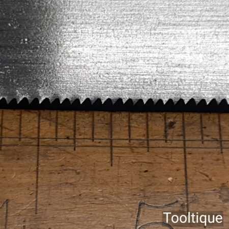 The saw has been thoroughly cleaned, jointed, resharpened and set by hand so that all the hard work of getting an old vintage saw right has been undertaken. We do this so that the next sharpening is easier and no more than a quick freshen up would be required. Those who are familiar with sharpening will know this is no small job and requires skill, effort and time to achieve good results.