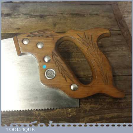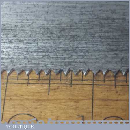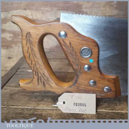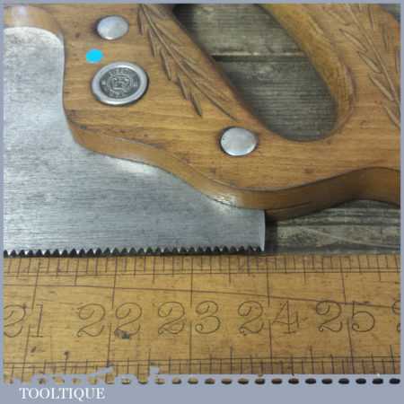 The saw has been thoroughly cleaned, jointed, resharpened and set by hand so that all the hard work of getting an old vintage saw right has been undertaken. We do this so that the next sharpening is easier and no more than a quick freshen up would be required. Those who are familiar with sharpening will know this is no small job and requires skill, effort and time to achieve good results.