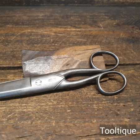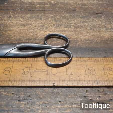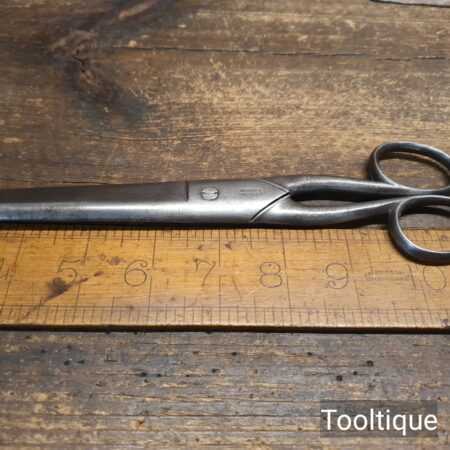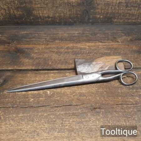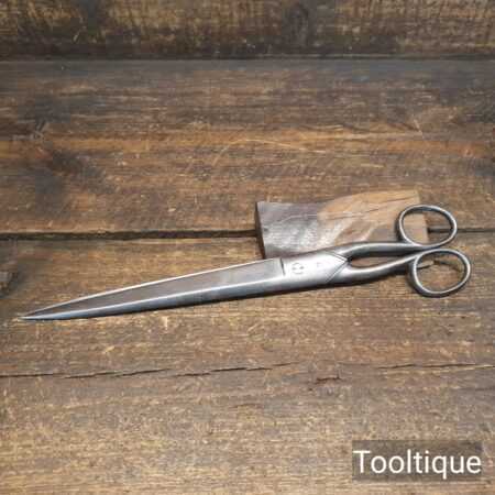 Vintage High quality 11″ paper scissors stamped ‘Warranted forge steel’ sharpened and in good used condition. Note: These scissors cut through paper like butter and are comfortable in the hand.