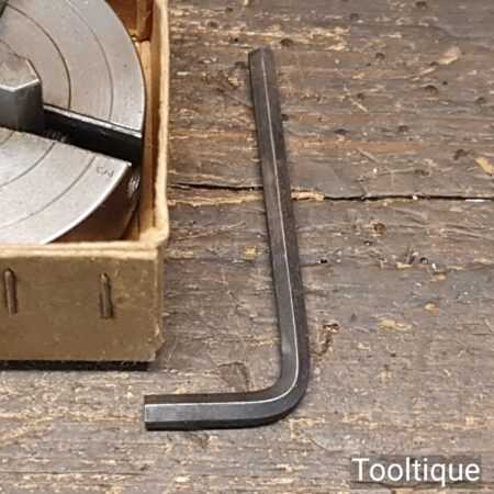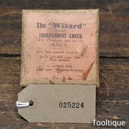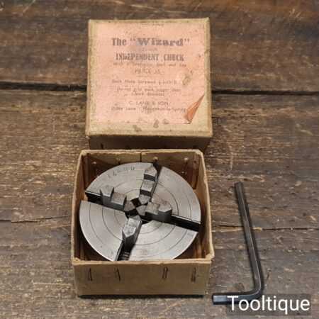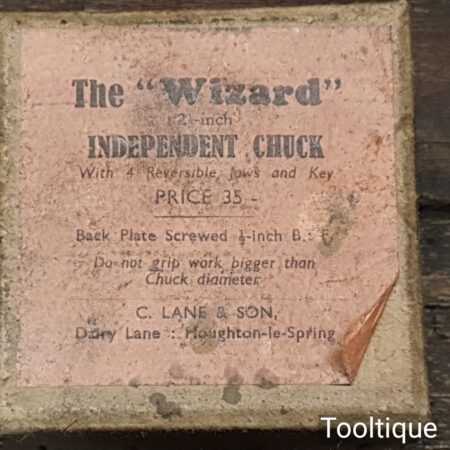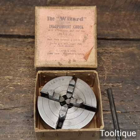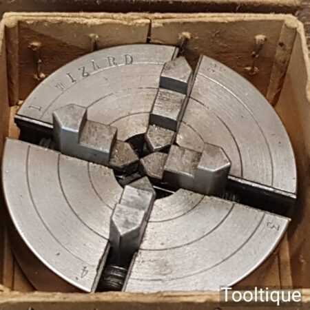 Vintage Imperial sized Wizard 2″ independent chuck with reversible jaws and key in original box.
