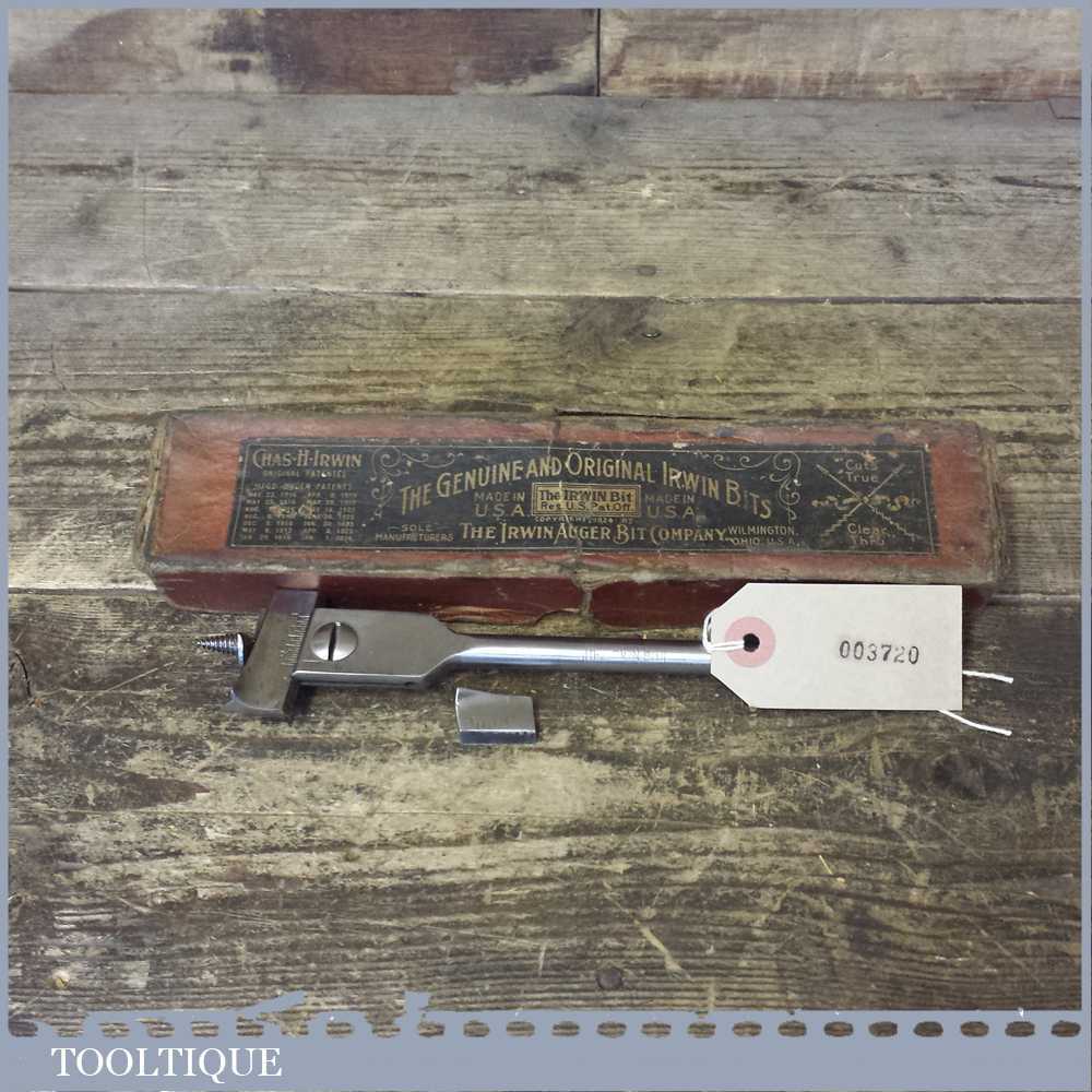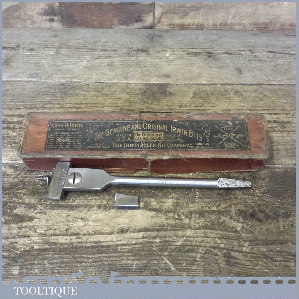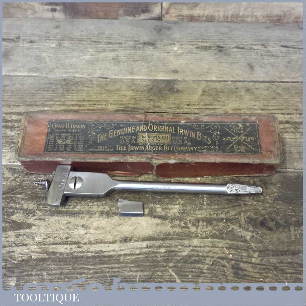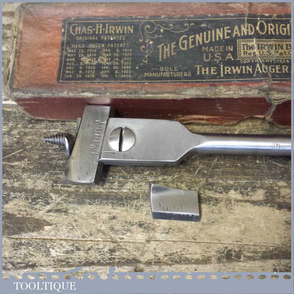 Vintage Irwin USA adjustable expanding auger bit with two sized cutters in its original box.
