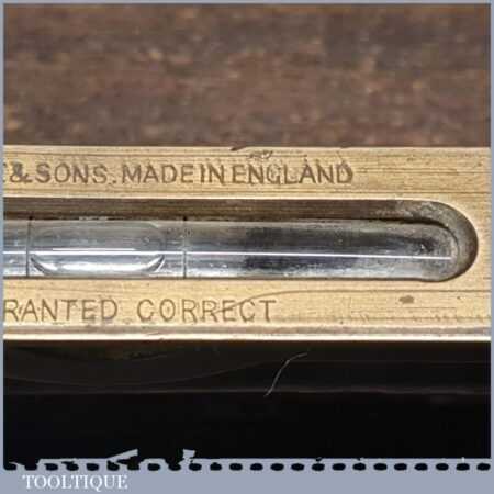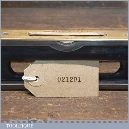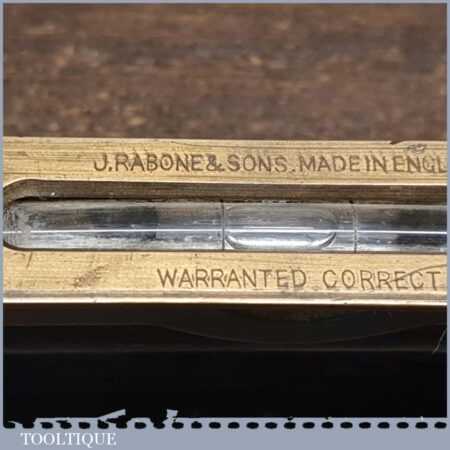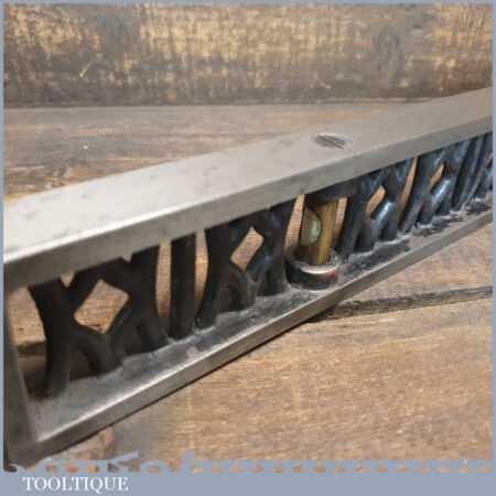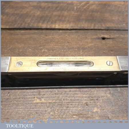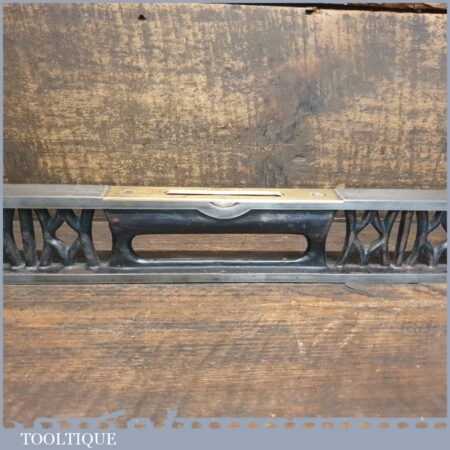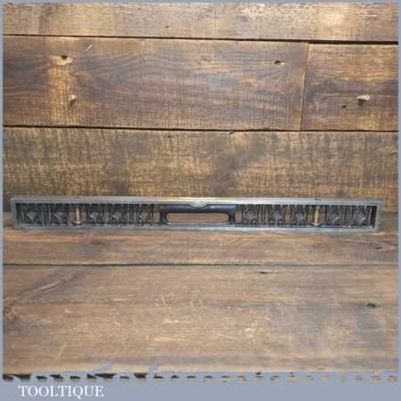 Vintage J. Rabone & Sons machinist’s 24” cast steel and brass spirit level with original clear bubble tubes in good used condition. Note: the level hasn’t been tested and may require adjustments.