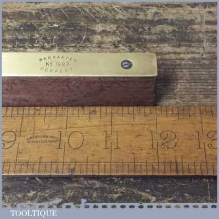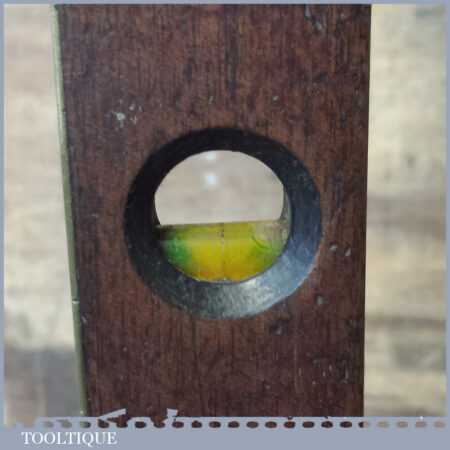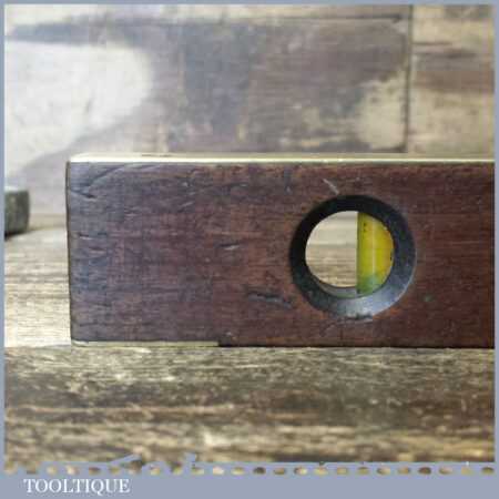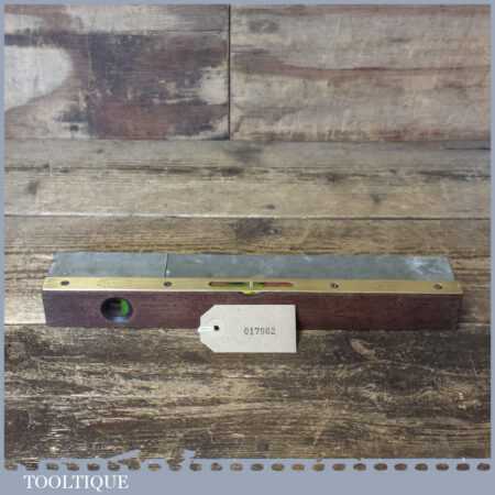 Vintage J. Rabone & Sons No: 1627 rosewood and brass 12” spirit level in original metal case and in good used condition. Note: The level has not been tested and may require resetting in putty if intended for use.
