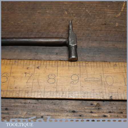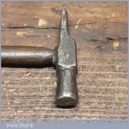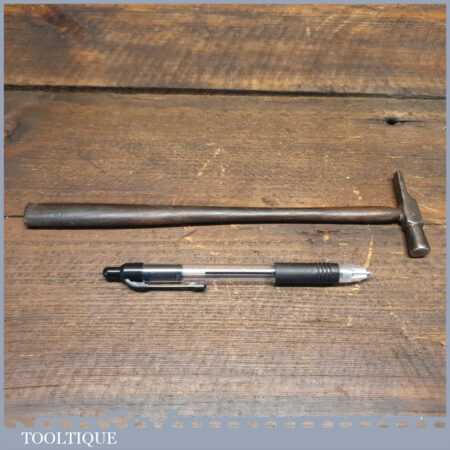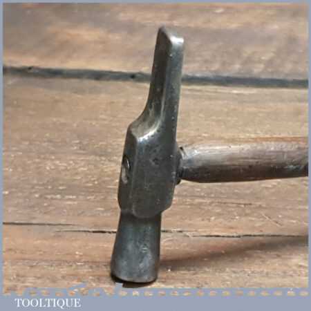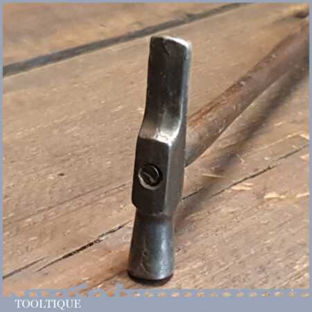 Vintage Jewellers cross pein hammer with bulbous wooden handle, in good used condition. Note: At first, I thought the screw was a bad repair but it seems to have been designed like this, after carefully removing it to inspect it the head is countersunk. Presumably because the screw extends past the seated position its purpose is to add strength to the handle where the forces are greater.