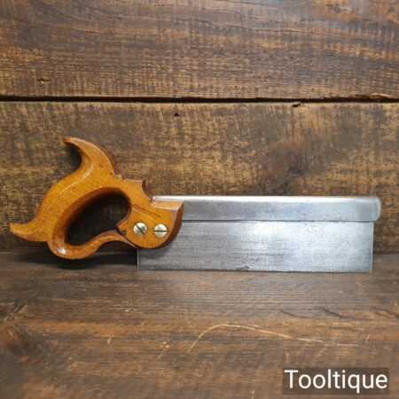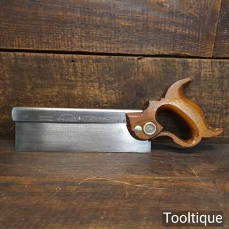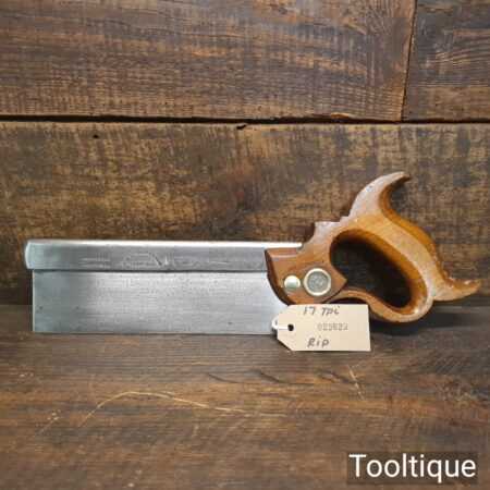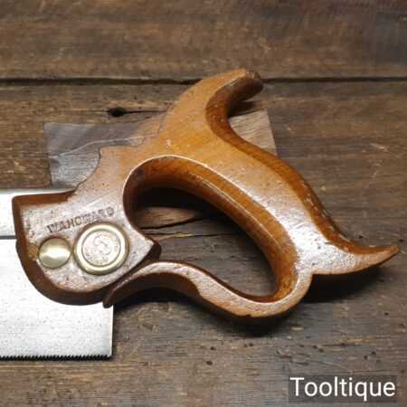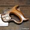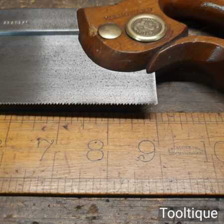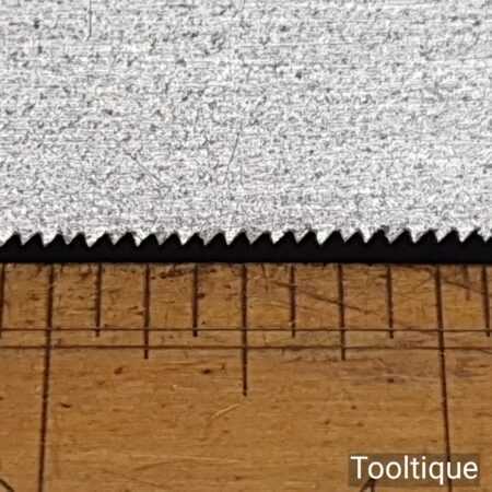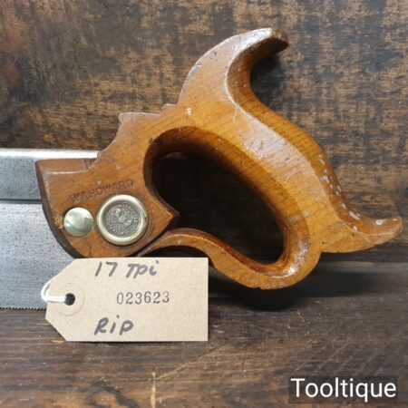 The saw has been thoroughly cleaned including under the handle, jointed, resharpened and set by hand so that all the hard work of getting an old vintage saw right has been undertaken. We do this so that the next sharpening is easier and no more than a quick freshen up would be required. Those who are familiar with sharpening will know this is no small job and requires skill, effort and time to achieve good results.