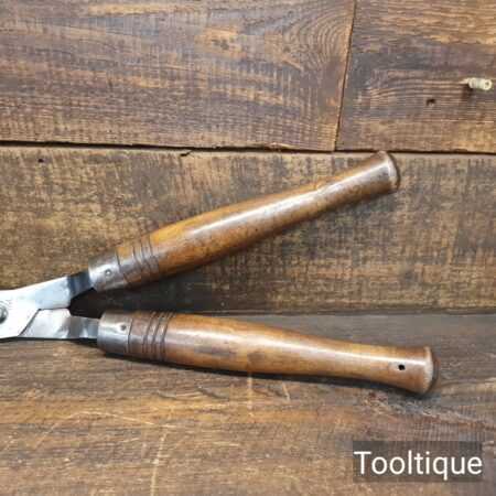Vintage John Guy Co. cast steel gardeners hedge trimming shears with beechwood handles measuring 22” in total length in good used condition, fully refurbished sharpened and honed ready for use. Note: these have been properly sharpened where they will slice rather than hack and will cut paper like scissors.