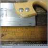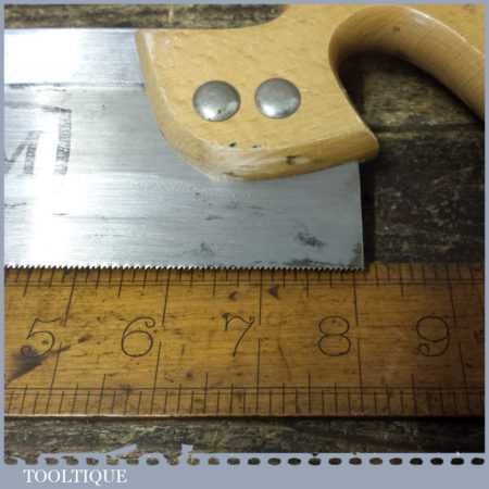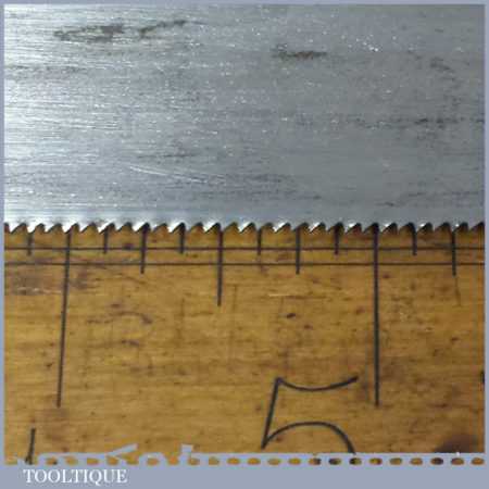 The saw has been thoroughly cleaned including under the handle, jointed, resharpened and set by hand so that all the hard work of getting an old vintage saw right has been undertaken. We do this so that the next sharpening is easier and no more than a quick freshen up would be required. Those who are familiar with sharpening will know this is no small job and requires skill, effort and time to achieve good results.