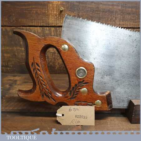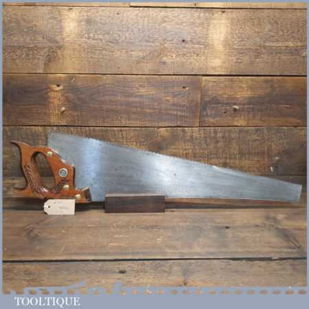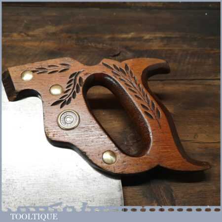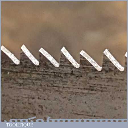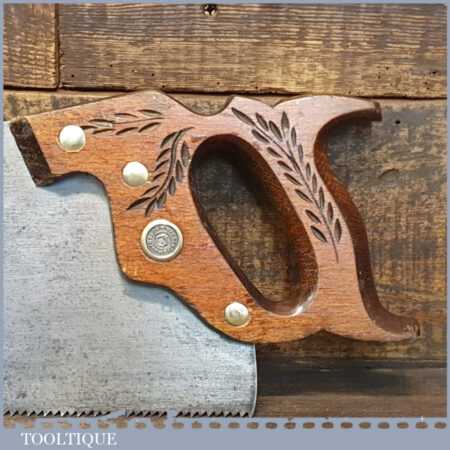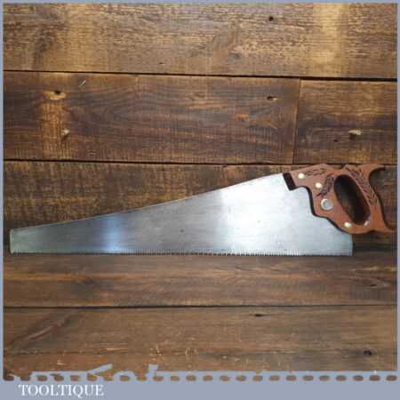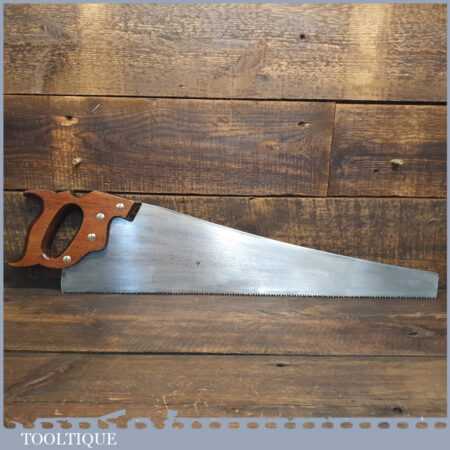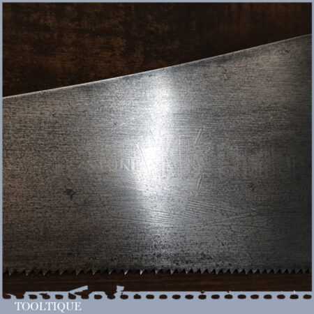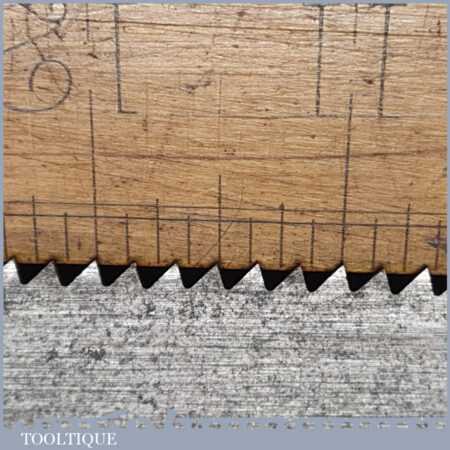 The saw has been thoroughly cleaned, jointed, resharpened and set by hand so that all the hard work of getting an old vintage saw right has been undertaken. We do this so that the next sharpening is easier and no more than a quick freshen up would be required. Those who are familiar with sharpening will know this is no small job and requires skill, effort and time to achieve good results.