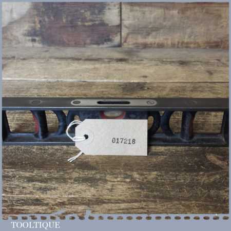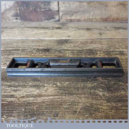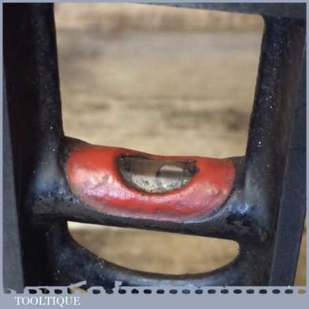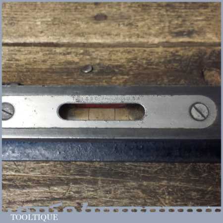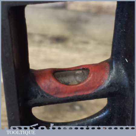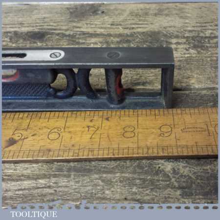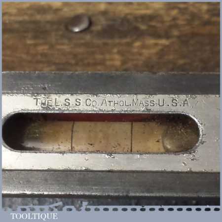 Vintage L.S.S. Co. (Starrett) USA machinist’s 9” cast steel spirit level with original clear bubble tubes in good used condition. Note: the level hasn’t been tested and may require resetting in putty if intended for use.