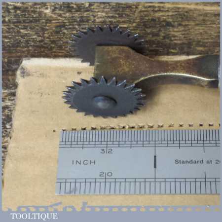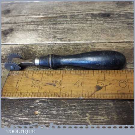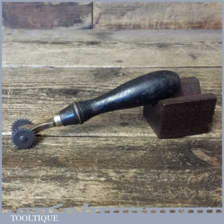 Vintage leatherworker’s brass bodied twin wheel stitch pricking wheel with ebonised handle in good used condition.
