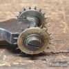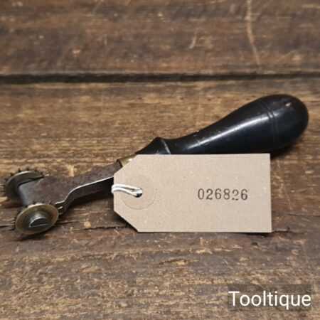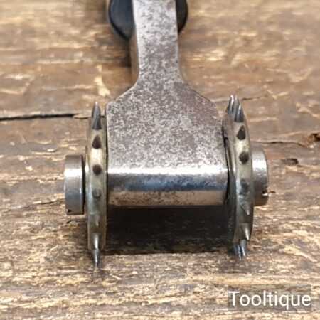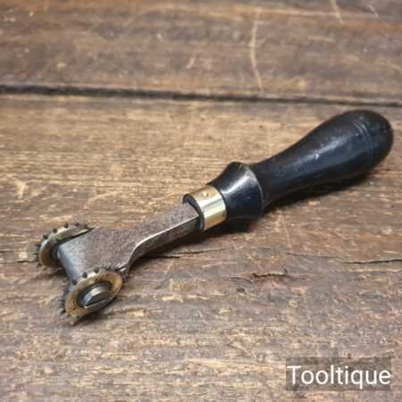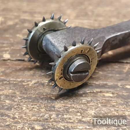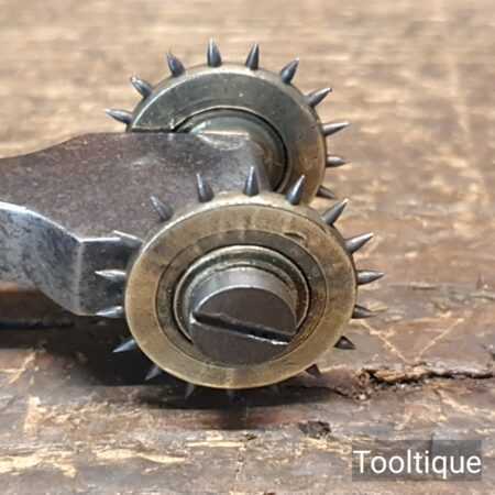 Vintage leatherworking stitch pricking twin brass wheel tool in good used condition.