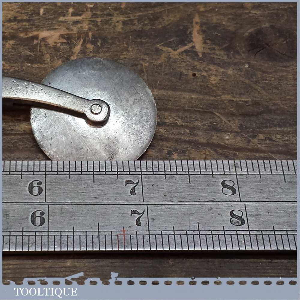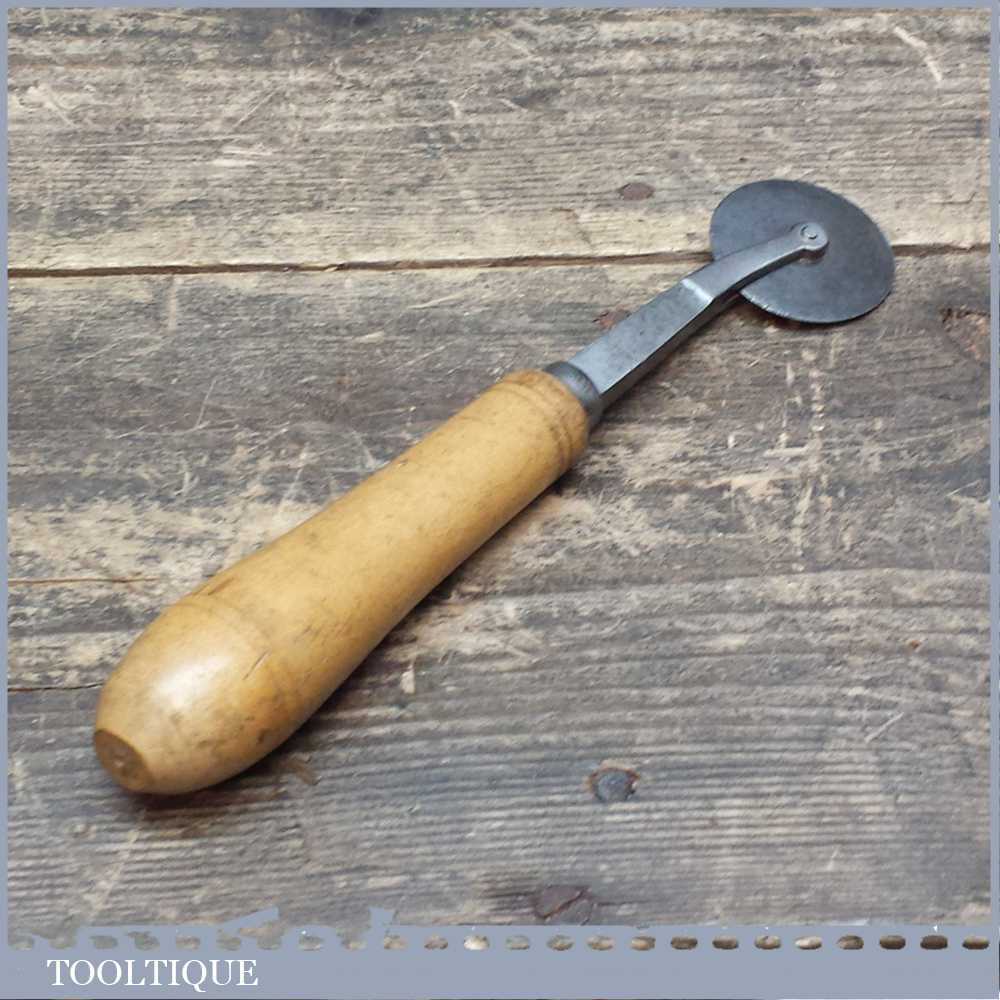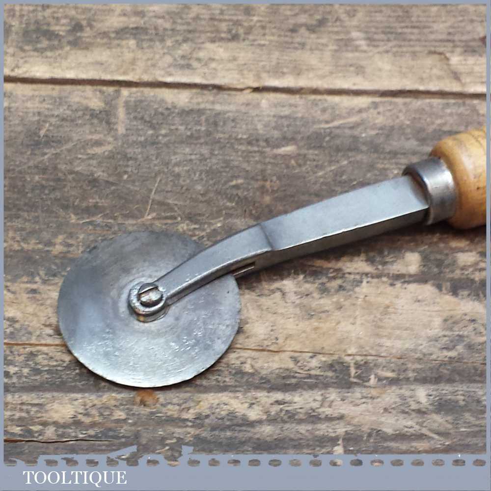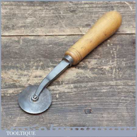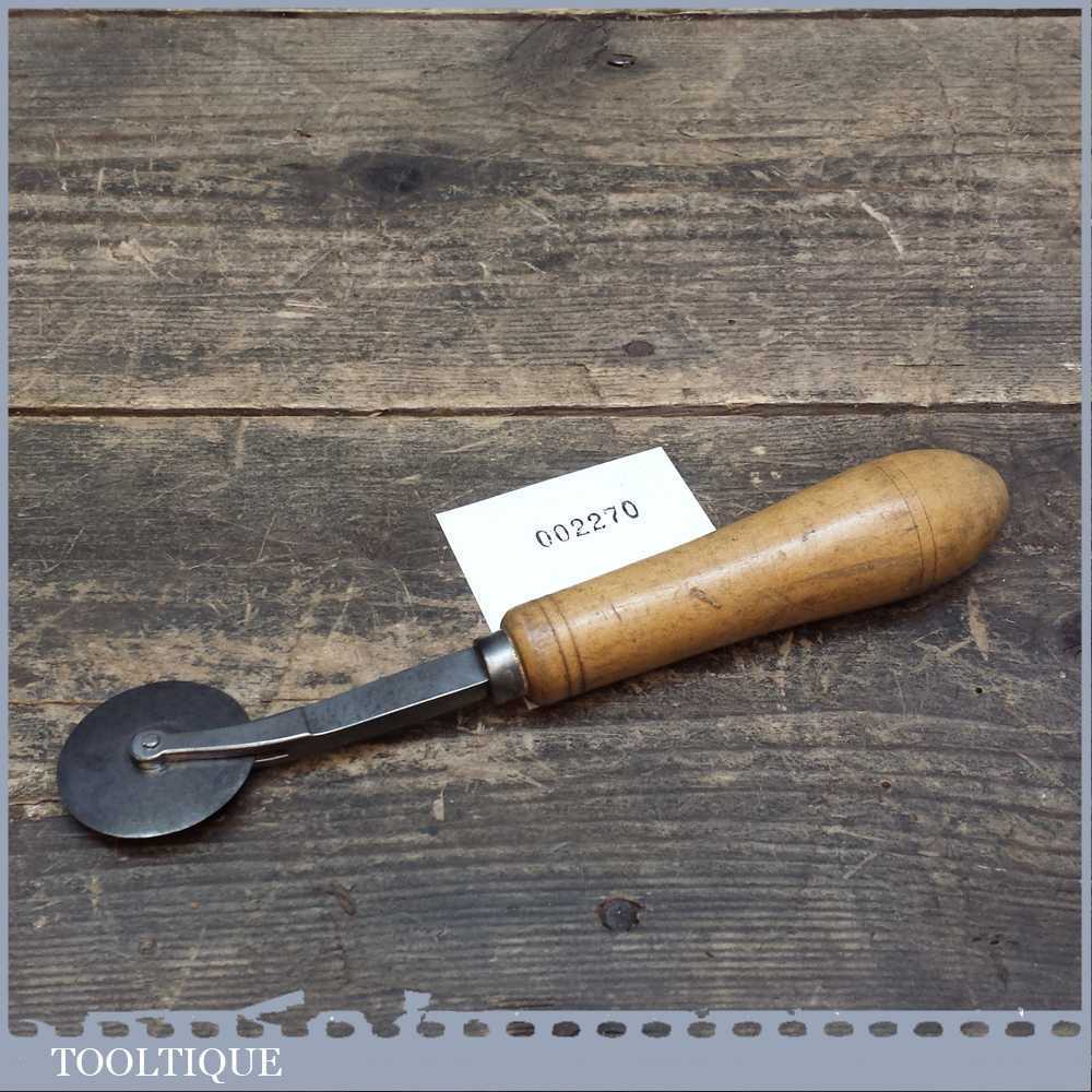 Vintage Leatherworking wheel. A small metal wheel mounted in a forked carriage, set in a wooden handle, total length is approx 7.3 Inches. The wheel is in a good used condition.