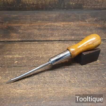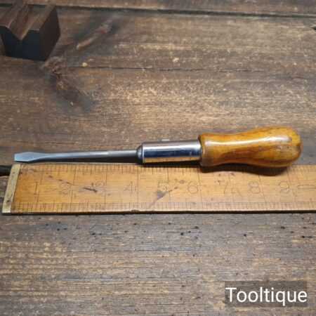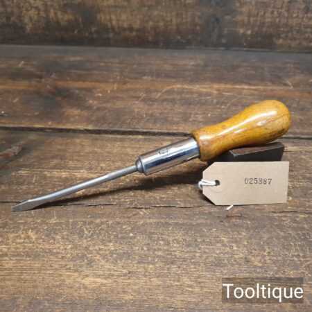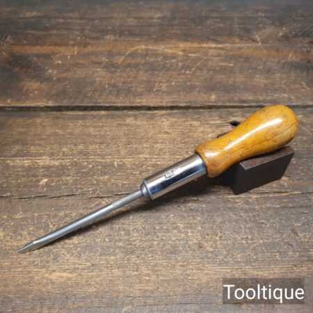 Vintage Ley’s 9″ ratchet turn screwdriver with beechwood handle in good used condition.