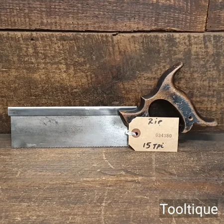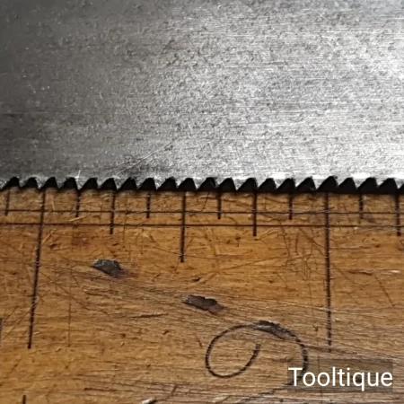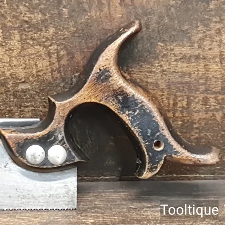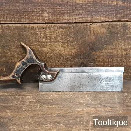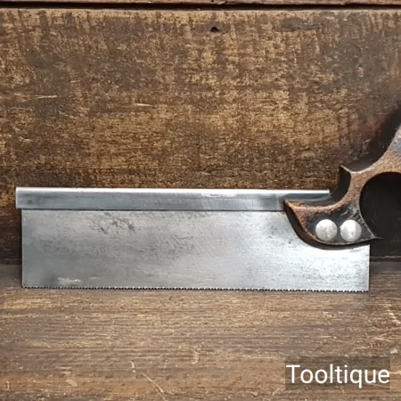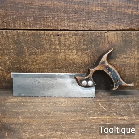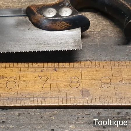 Vintage lightweight Steel Back Dovetail saw, refurbished ready for use and in good used condition. The saw has been thoroughly cleaned, jointed, resharpened and set by hand so that all the hard work of getting an old vintage saw right has been undertaken. We do this so that the next sharpening is easier and no more than a quick freshen up would be required. Those who are familiar with sharpening will know this is no small job and requires skill, effort and time to achieve good results.