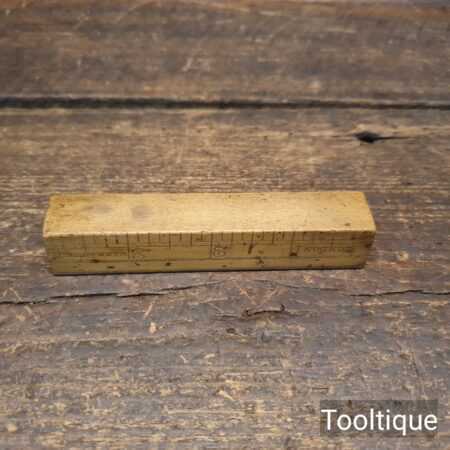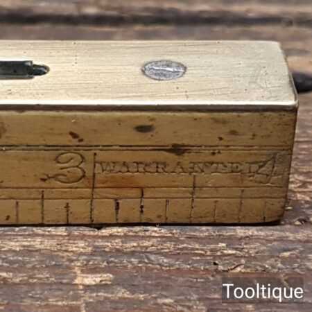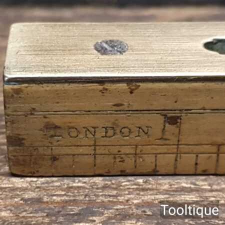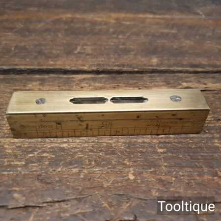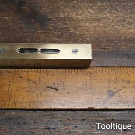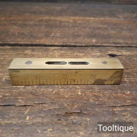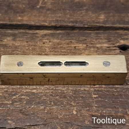 Vintage London Brass and boxwood machinist’s spirit level calibrated with 4″ rule markings, in good used condition.