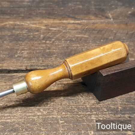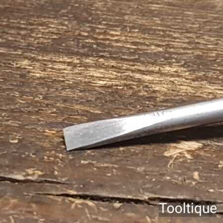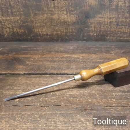 Vintage long reach slimline flat screwdriver with 3/16” wide end and boxwood London pattern handle. The screwdriver has redressed head using water-cooled process and is in good used condition
