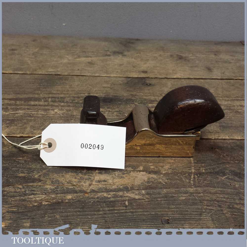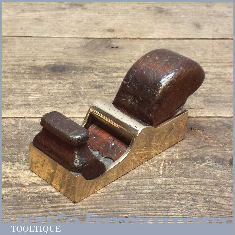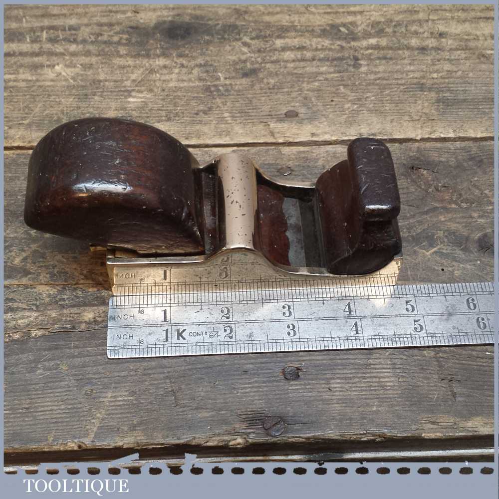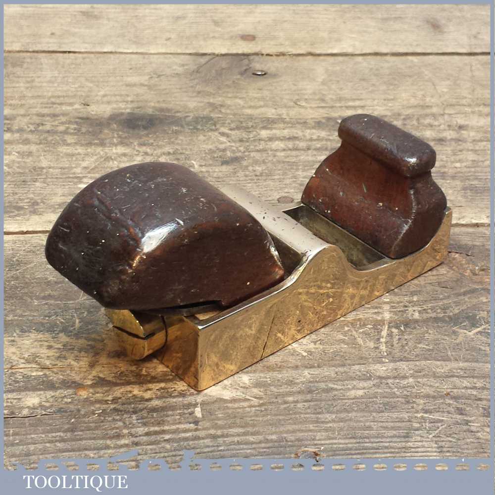 Vintage low angle Brass and rosewood infill chariot plane measuring 4 ¾” long. It’s in good overall condition (see images). The longer length is quite unusual but was a factor in achieving the lower angle iron and was why it was probably made by a pattern maker.