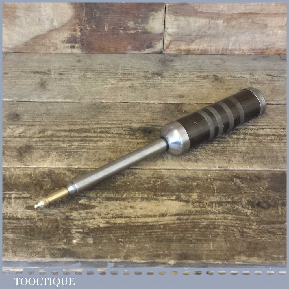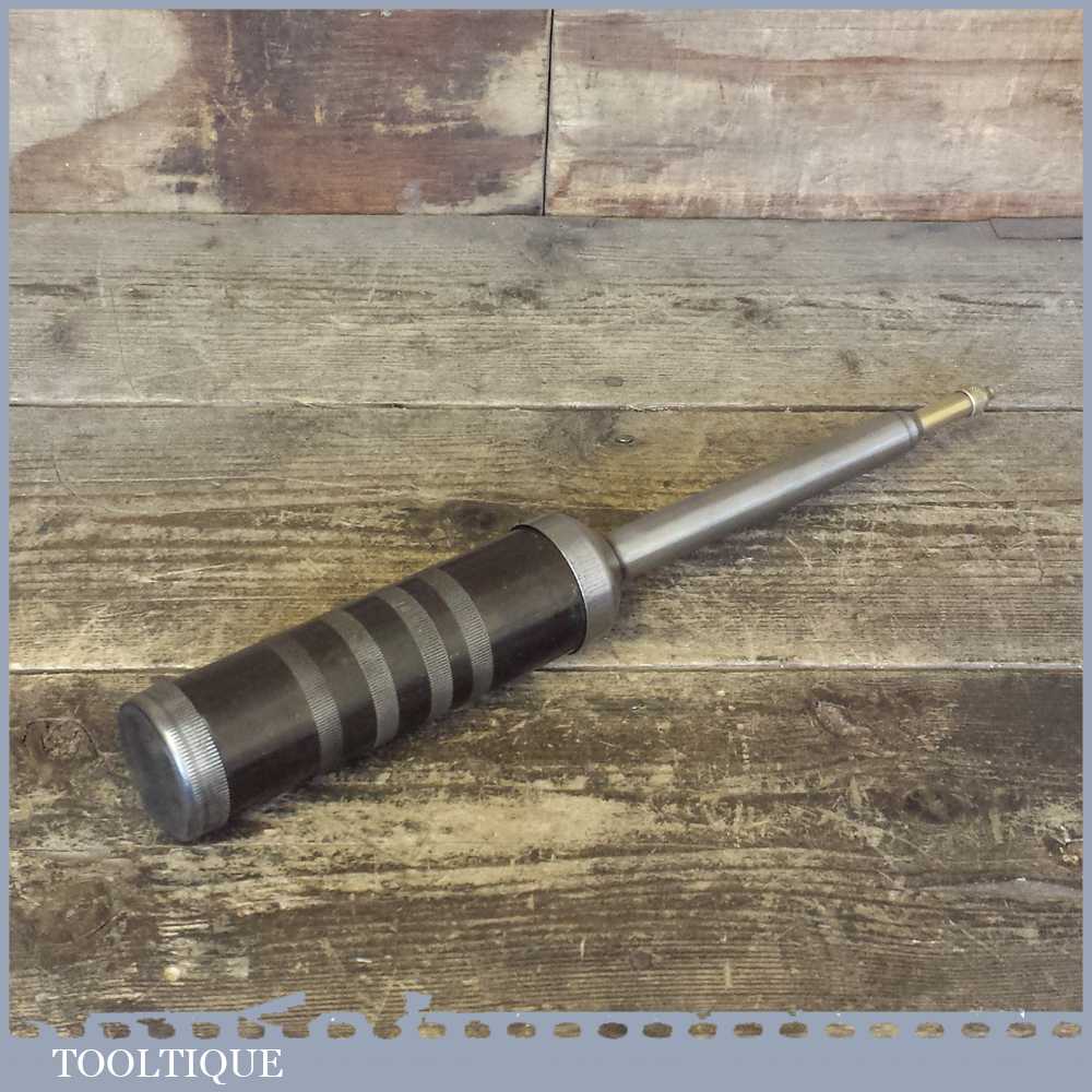 Vintage Machine turned Steel compress pump action grease gun with brass nib. It is unmarked but probably had a label at some time to identify manufacturer, but it’s in good used condition and is solid. Measures approx 14 ½” long.