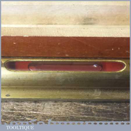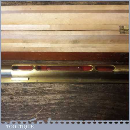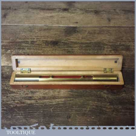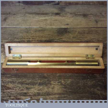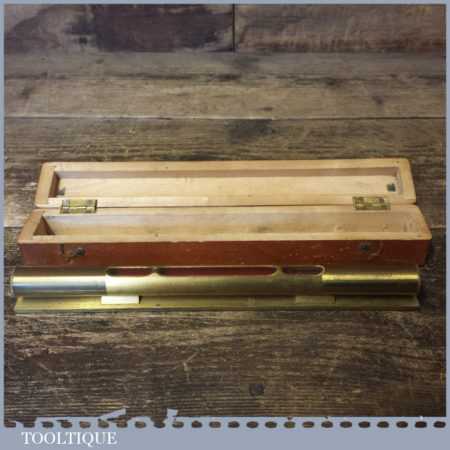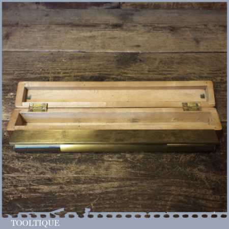 Vintage machinist’s engineering brass spirit level in nice beechwood box with brass hinges in good used condition. Note: the level has not been tested and may require resetting in putty if intended for use.