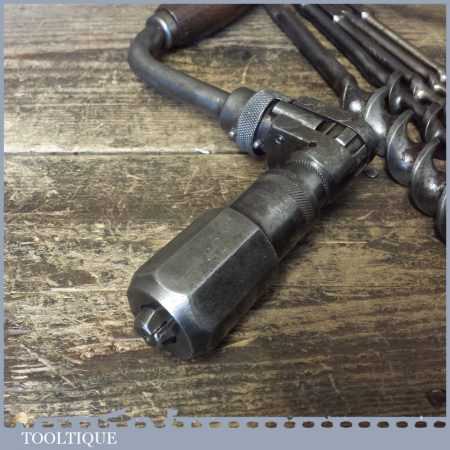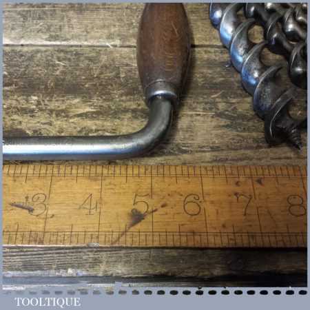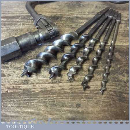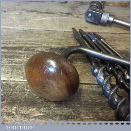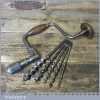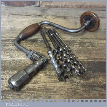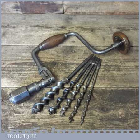 Vintage Macrome ratchet brace with a 10” swing and set 5 No: bits (3/8” – 1”) by various makers, in good working order and ready for use.