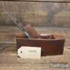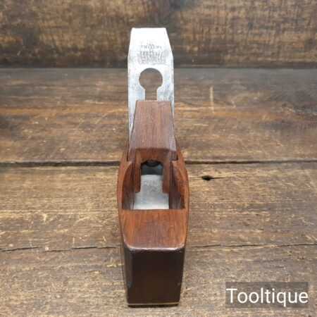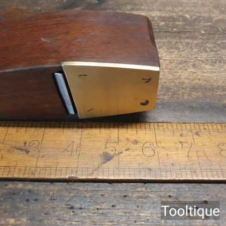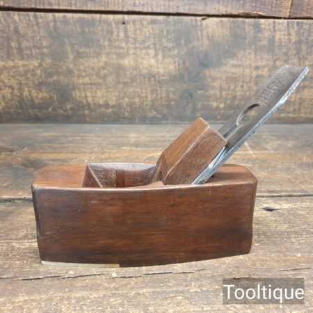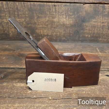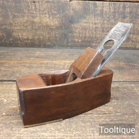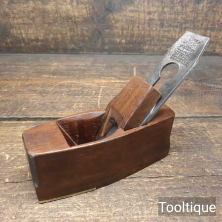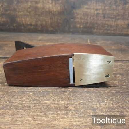 Small vintage Mahogany coffin shaped smoothing plane with brass infill on sole measuring 6” in total length in good used condition. Note: This plane has been lapped flat and the iron and chip breaker have been refurbished, sharpened and fettle in ready for use.