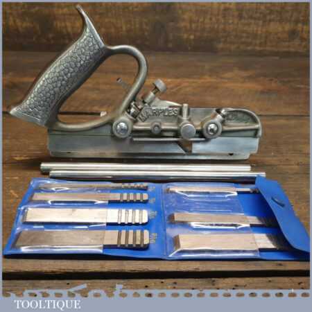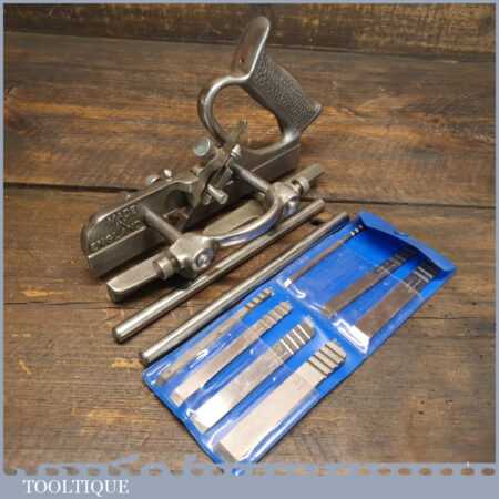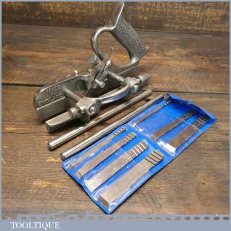 Vintage Marples No: MA44 plough plane complete with 8 cutters, fully refurbished and ready for use. The plane is in good condition and all components move smoothly. Note: We do not sharpen the irons.