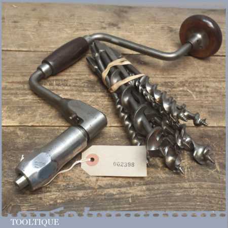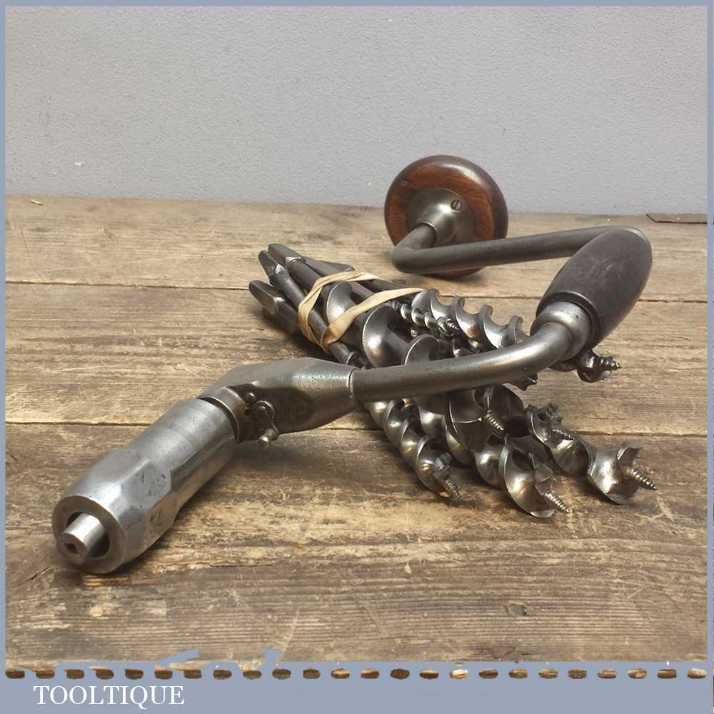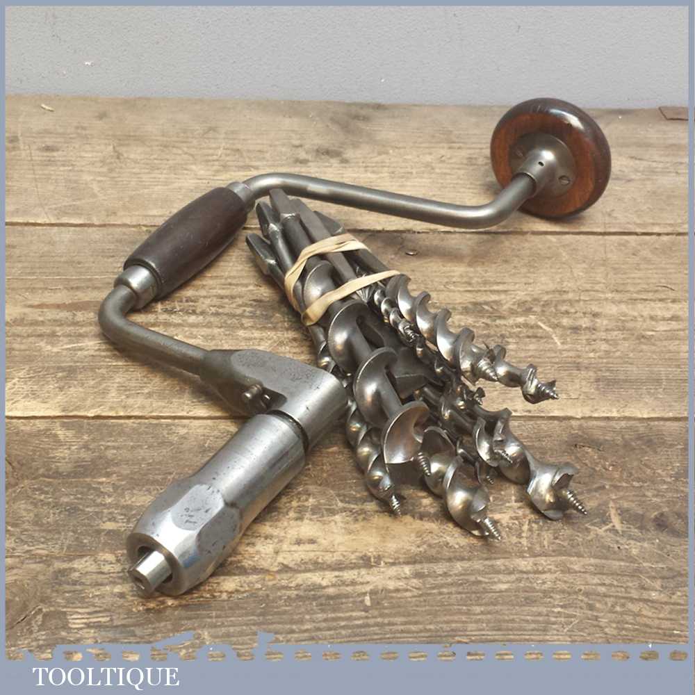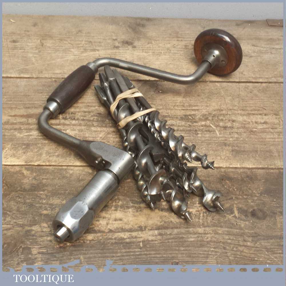 Vintage wooden handled ratchet brace with a approx 6” swing and a selection of various sized twist bits.