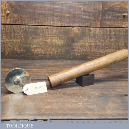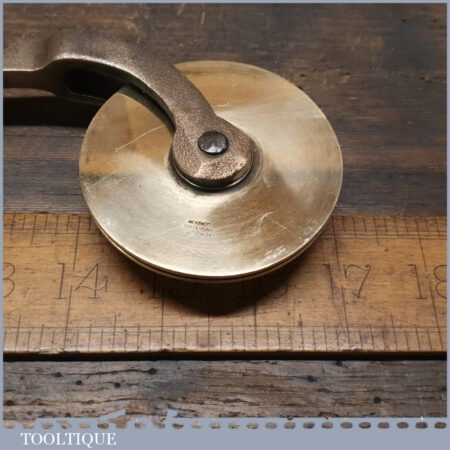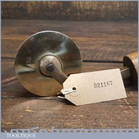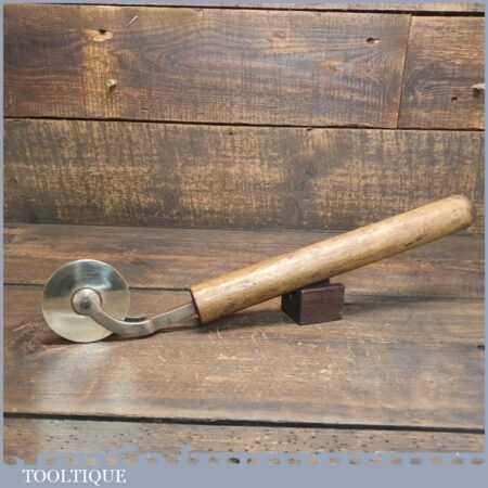 Vintage Mercury Engraving of London wooden handled brass bookbinding wheel in good used condition. (Mercury Engraving) was established at City Road, Islington in 1965 and specialised in dies and tools for the foil printing and embossing trades.