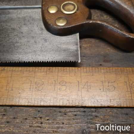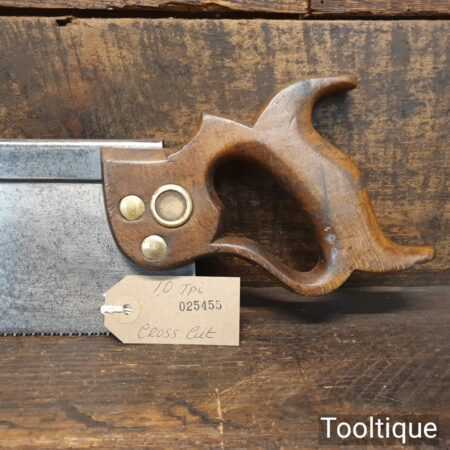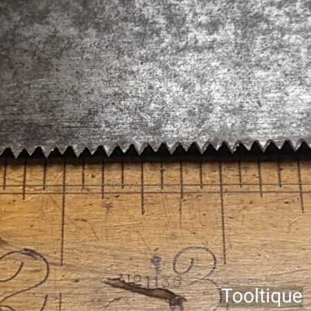 The saw has been thoroughly cleaned, jointed, resharpened, and set by hand so that all the hard work of getting an old vintage saw right has been undertaken. We do this so that the next sharpening is easier and no more than a quick freshen up would be required. Those who are familiar with sharpening will know this is no small job and requires skill, effort, and time to achieve good results.