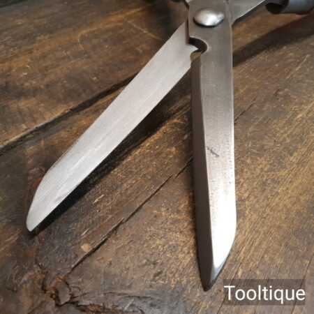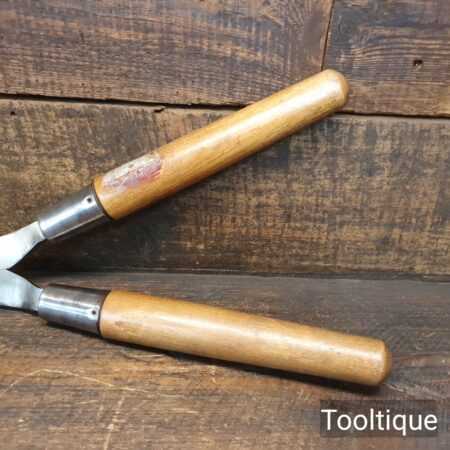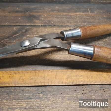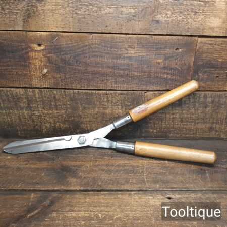 Vintage Moon & Ball Garden shears with beechwood handles measuring 22 ½” in total length in good used condition, fully refurbished sharpened and honed ready for use. Note: these have been properly sharpened where they will slice rather than hack and will cut paper like scissors. The faces have also been dressed to eliminate wear.