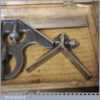 Vintage Moore & Wright cast steel combination square, protractor and centre finder complete in its original wooden box and in good used condition. Note: Bubble missing in the square.
