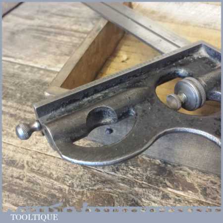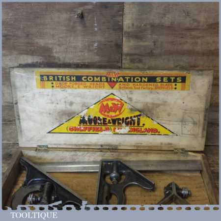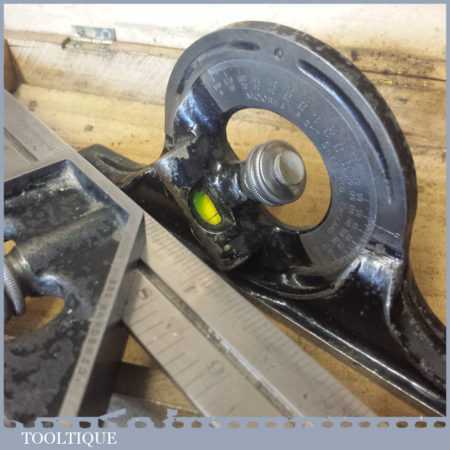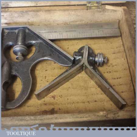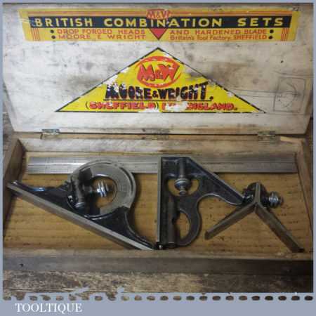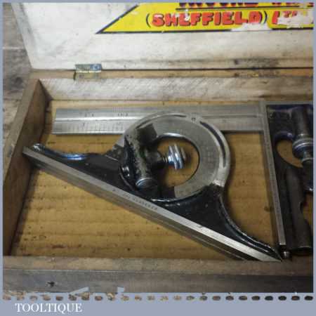 Vintage Moore & Wright cast steel combination square, protractor and centre finder complete in its original wooden box and in good used condition. Note: Bubble missing in the square.
