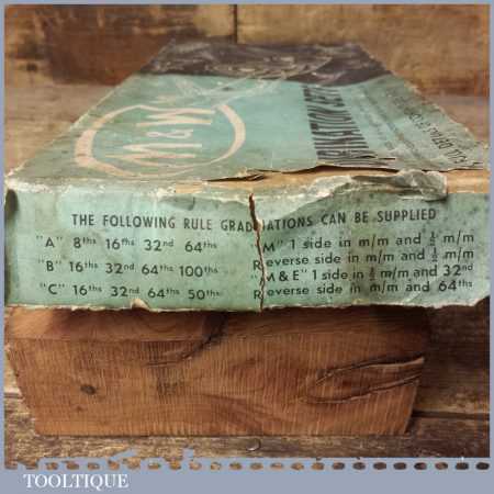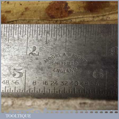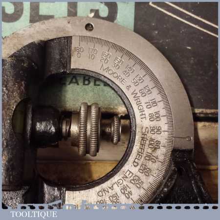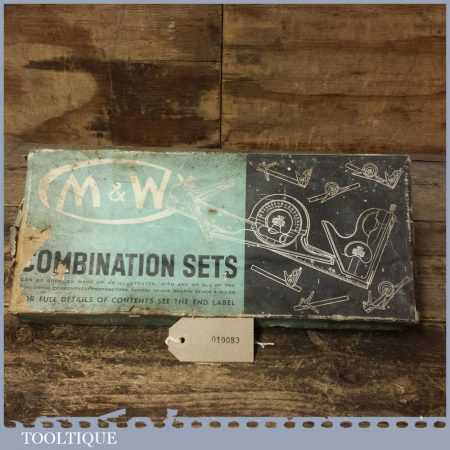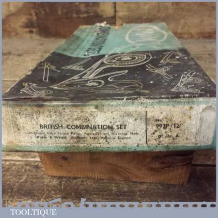 Vintage boxed Moore & Wright cast steel combination square, protractor and centre finder complete and in good used condition.