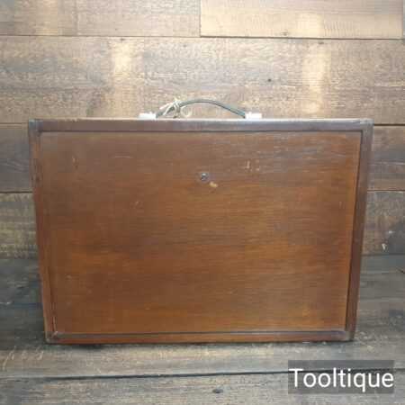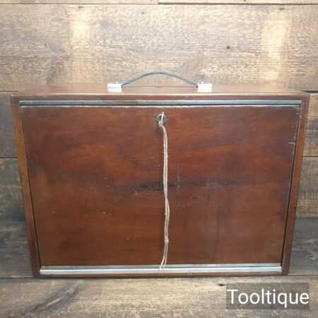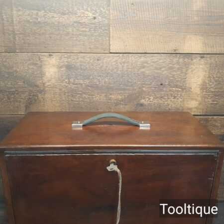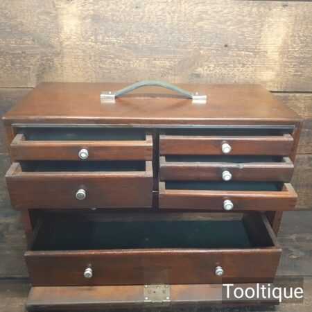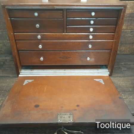 Vintage Neslein Engineers 8 draw wooden toolbox with locking front panel and key in good used condition.