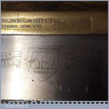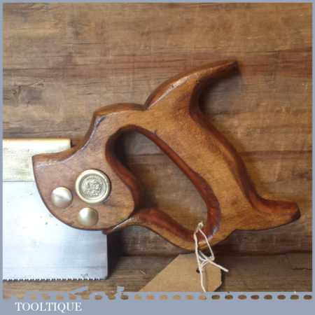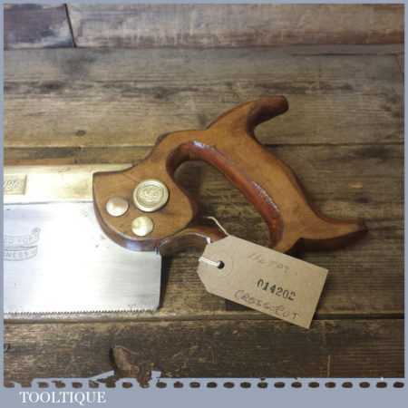 The saw has been thoroughly cleaned including under the handle, jointed, resharpened and set by hand so that all the hard work of getting an old vintage saw right has been undertaken. We do this so that the next sharpening is easier and no more than a quick freshen up would be required. Those who are familiar with sharpening will know this is no small job and requires skill, effort and time to achieve good results.