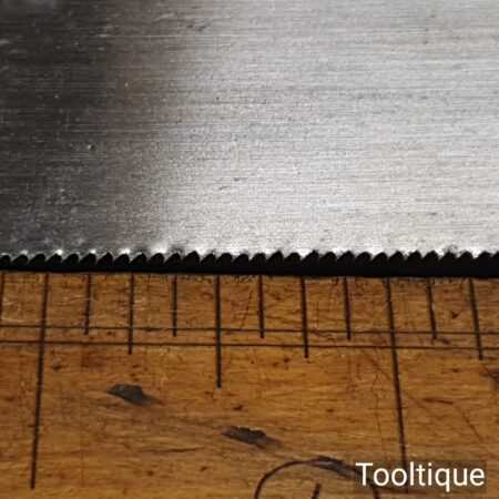 The saw has been thoroughly cleaned including under the handle, jointed, resharpened and set by hand so that all the hard work of getting an old vintage saw right has been undertaken. We do this so that the next sharpening is easier and no more than a quick freshen up would be required. Those who are familiar with sharpening will know this is no small job and requires skill, effort and time to achieve good results