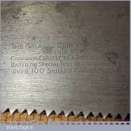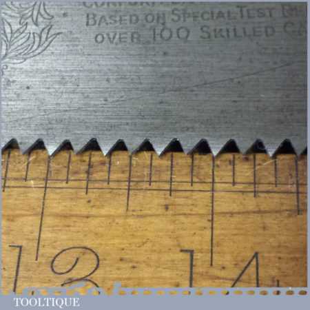 The saw has been thoroughly cleaned, jointed, resharpened and set by hand so that all the hard work of getting an old vintage saw right has been undertaken. We do this so that the next sharpening is easier and no more than a quick freshen up would be required. Those who are familiar with sharpening will know this is no small job and requires skill, effort and time to achieve good results.