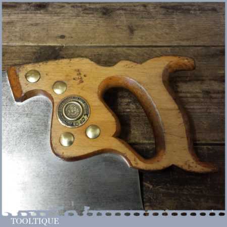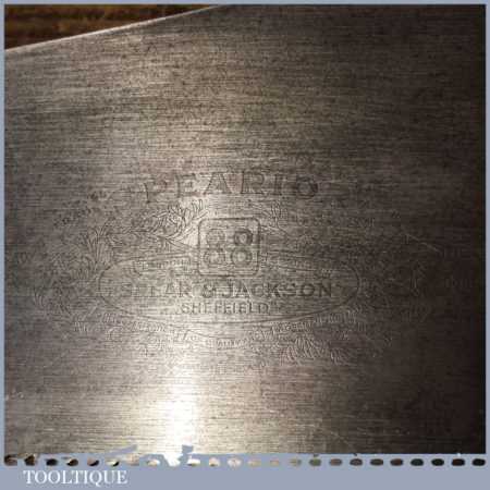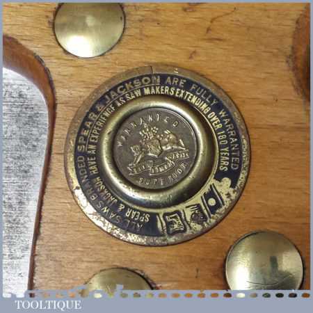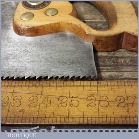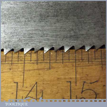 The saw has been thoroughly cleaned, jointed, resharpened and set by hand so that all the hard work of getting an old vintage saw right has been undertaken. We do this so that the next sharpening is easier and no more than a quick freshen up would be required. Those who are familiar with sharpening will know this is no small job and requires skill, effort and time to achieve good results.
