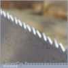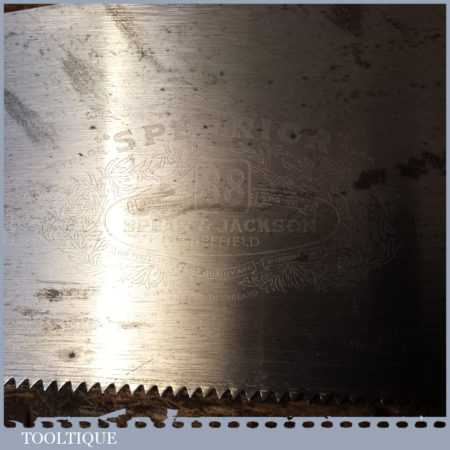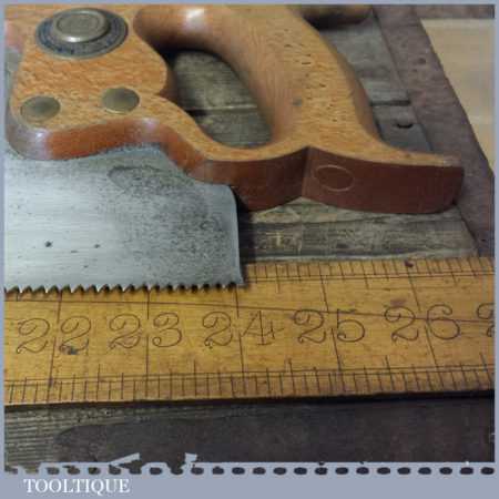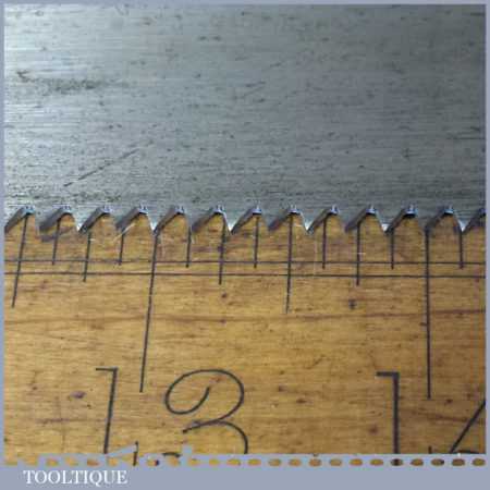 The saw has been thoroughly cleaned, jointed, resharpened and set by hand so that all the hard work of getting an old vintage saw right has been undertaken. We do this so that the next sharpening is easier and no more than a quick freshen up would be required. Those who are familiar with sharpening will know this is no small job and requires skill, effort and time to achieve good results.