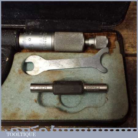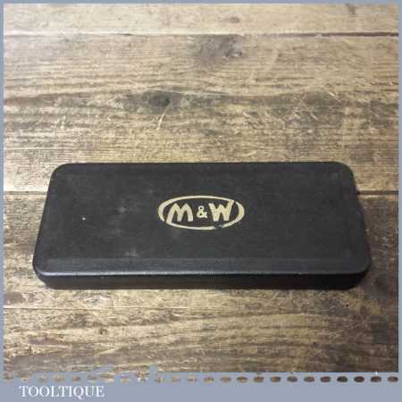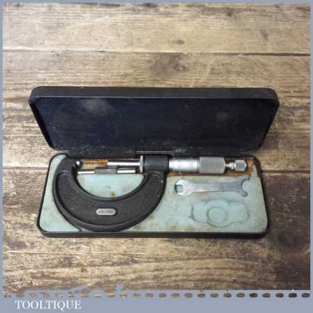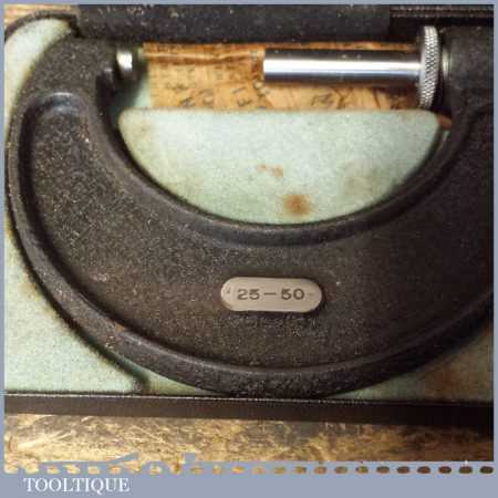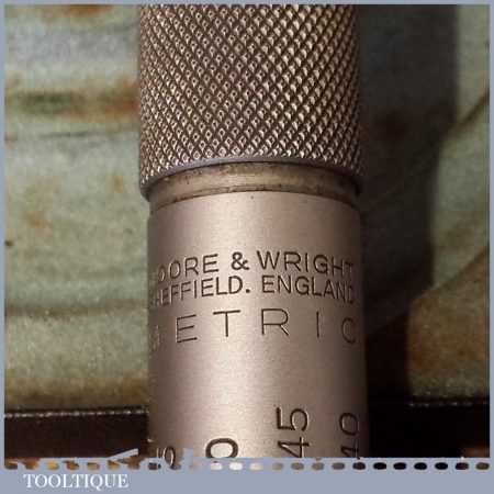 Vintage No. 966M boxed Moore & Wright 25-50mm metric micrometer complete and in good used condition.