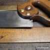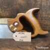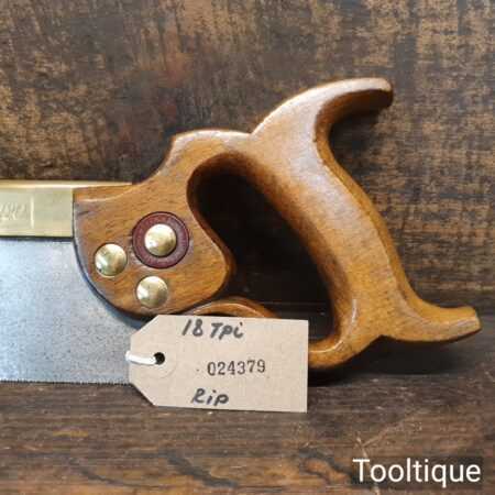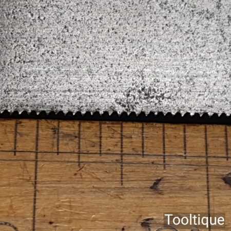 The saw has been thoroughly cleaned, jointed, resharpened and set by hand so that all the hard work of getting an old vintage saw right has been undertaken. We do this so that the next sharpening is easier and no more than a quick freshen up would be required. Those who are familiar with sharpening will know this is no small job and requires skill, effort and time to achieve good results.