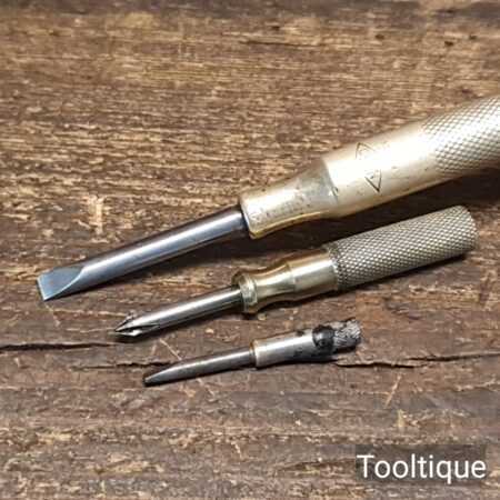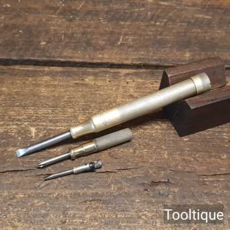 Vintage Nubo Foreign brass and steel screwdriver with 2 smaller screwdrivers in good used condition.