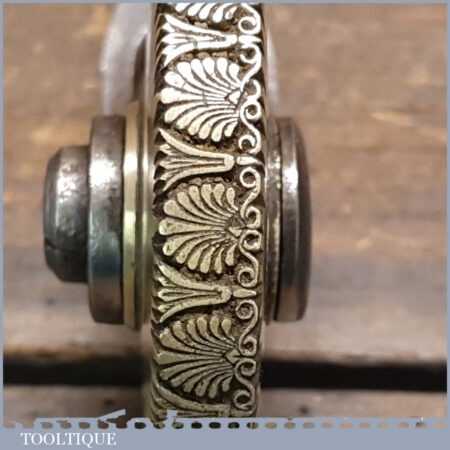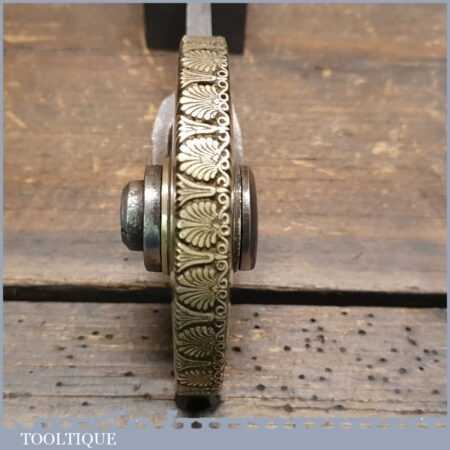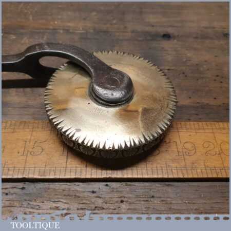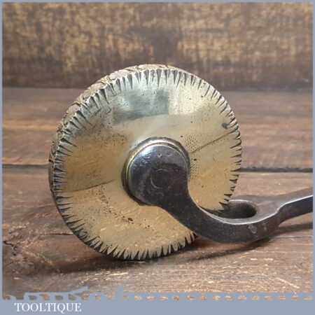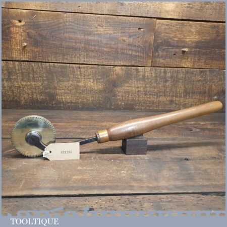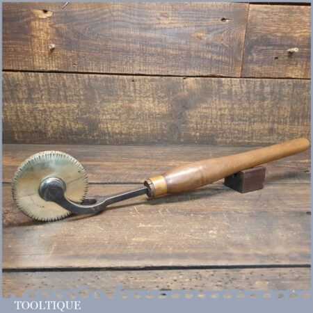Vintage Ornate wooden handled brass bookbinding scrolled wheel in good used condition.